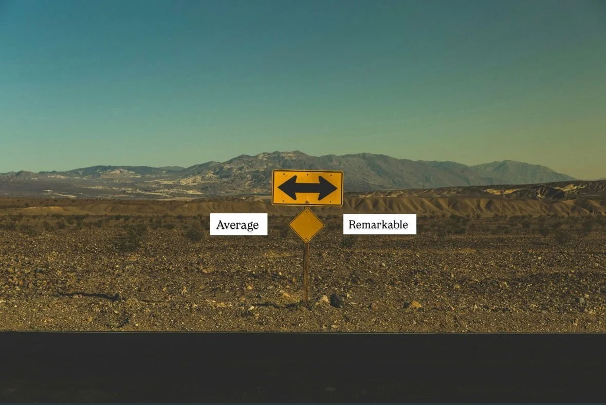 Alt Text: Yellow road sign in a desert showing arrows pointing left to "Average" and right to "Remarkable," symbolizing the choice leaders face in how they communicate.
